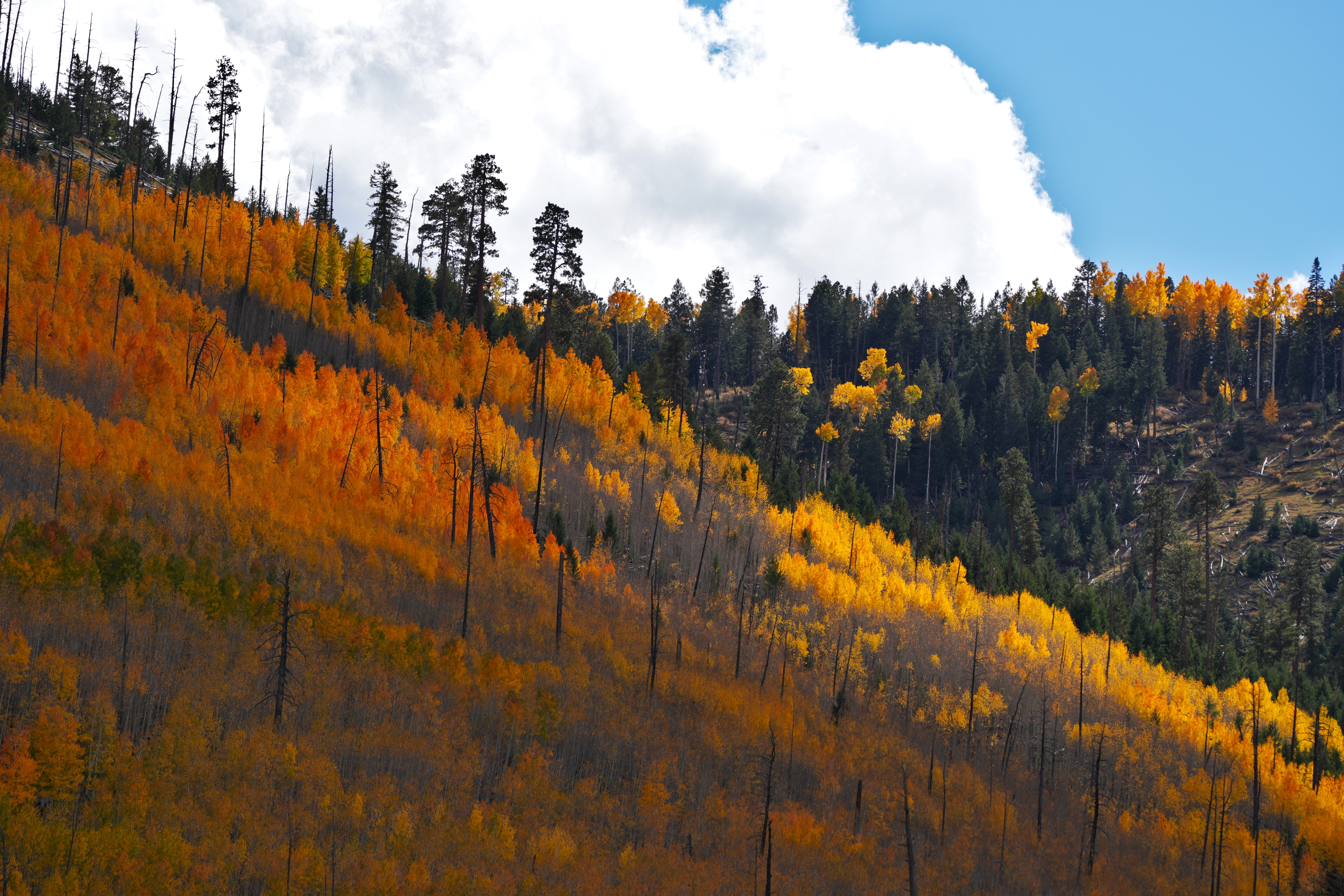 View northwest from Humphreys Peak overlooking forests and distant blue mountain ranges near Flagstaff, Arizona.