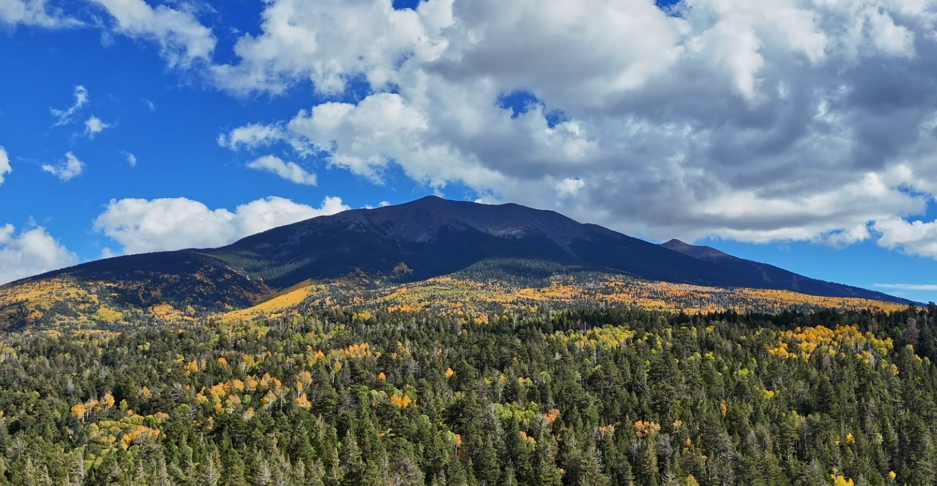 Wide aerial view of forested hills leading up to a prominent mountain peak.