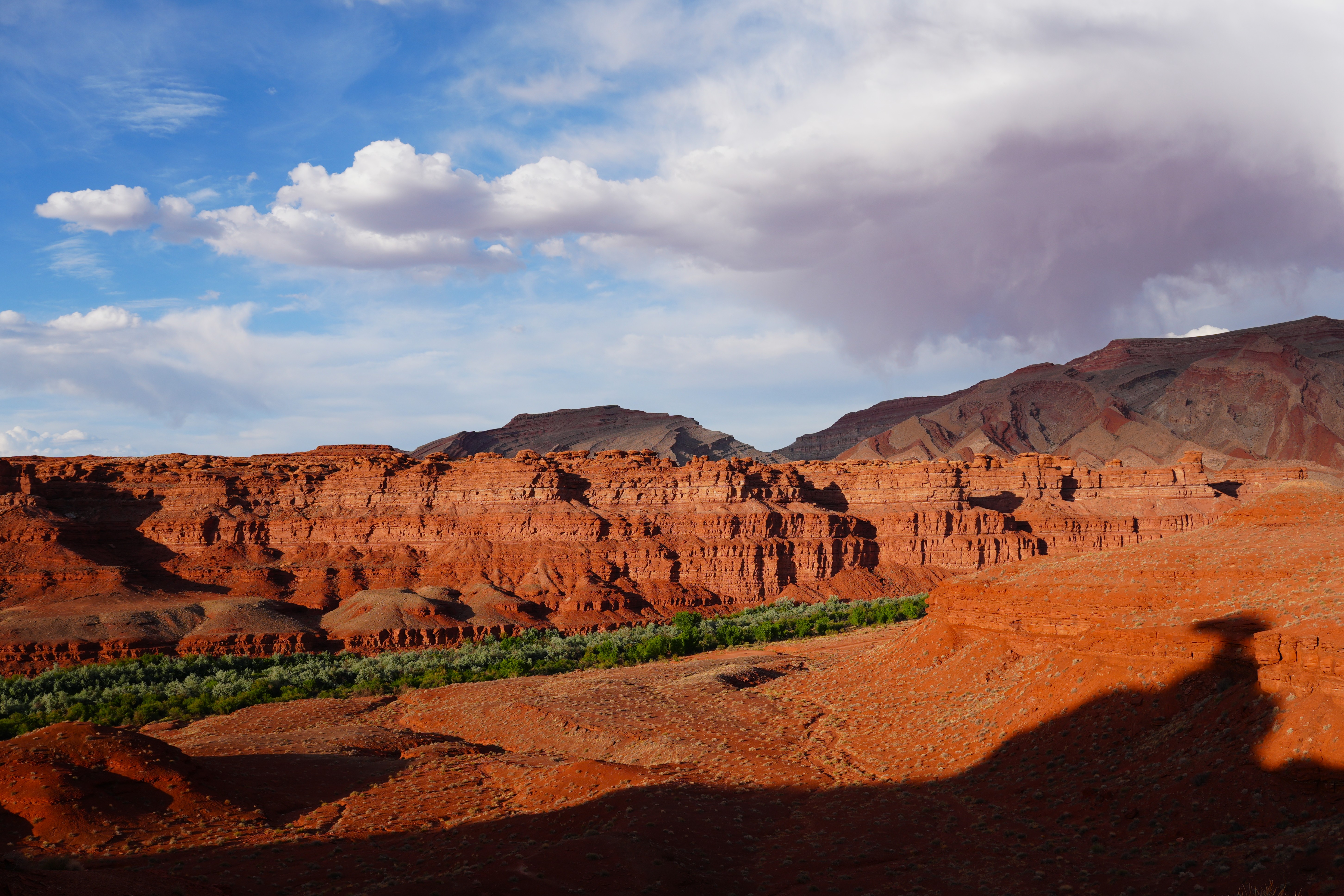 - Mexican Hat Rock casting shadow over red desert landscape