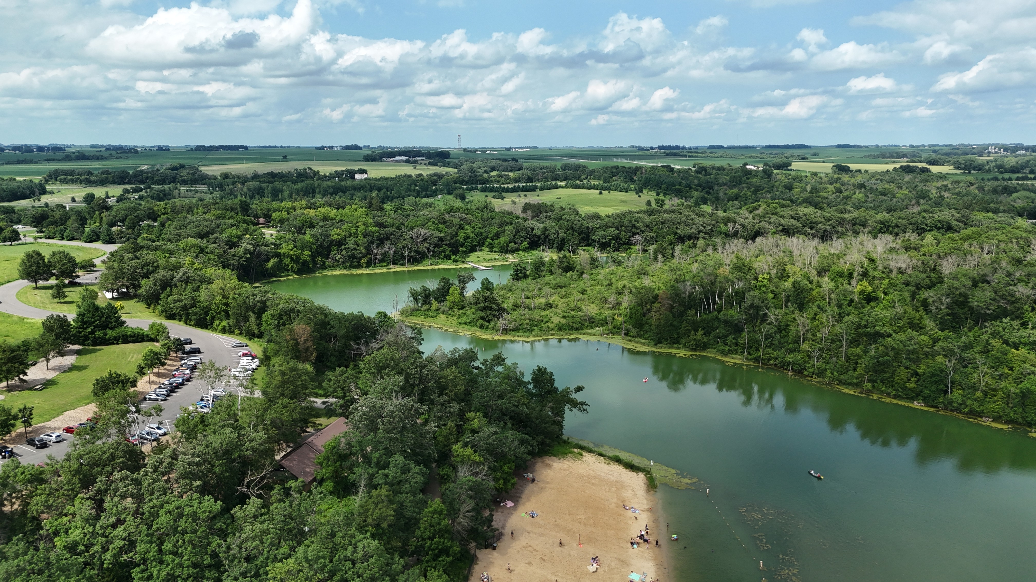 Aerial view of a calm lake and surrounding greenery in rural Minnesota.