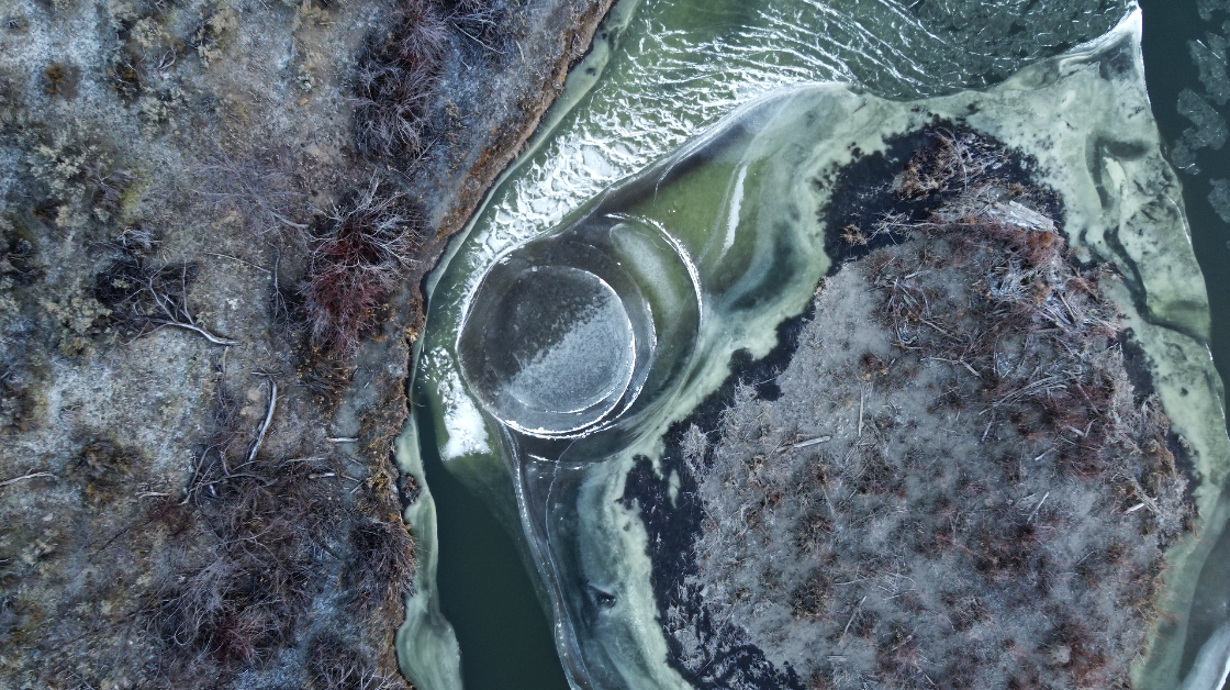 Aerial view of a naturally formed ice disc spinning within a frozen river during winter conditions.